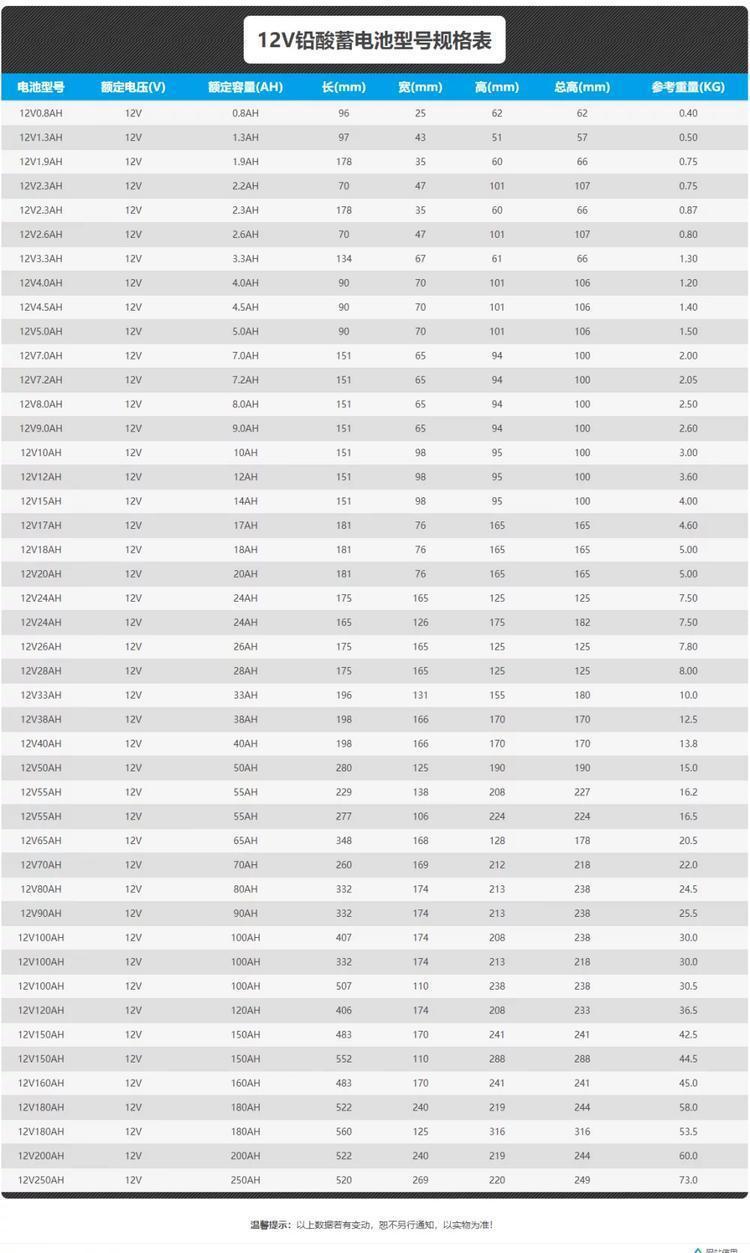 1.电压等级:12V;容量范围:5Ah-33Ah(C20,25°C),38Ah-250Ah(C10,25°℃);
